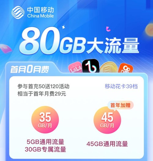 首年月租僅需29元,流量高達80GB,其中50GB是通用流量,30GB是定向流量,套外流量5元/G,當月有效,自動續訂,語音0.1元每分鐘,短信0.1元/條,相比其他套餐價格更親民。而且,首充時還有驚喜福利,充50元就送120元,分12個月返還。